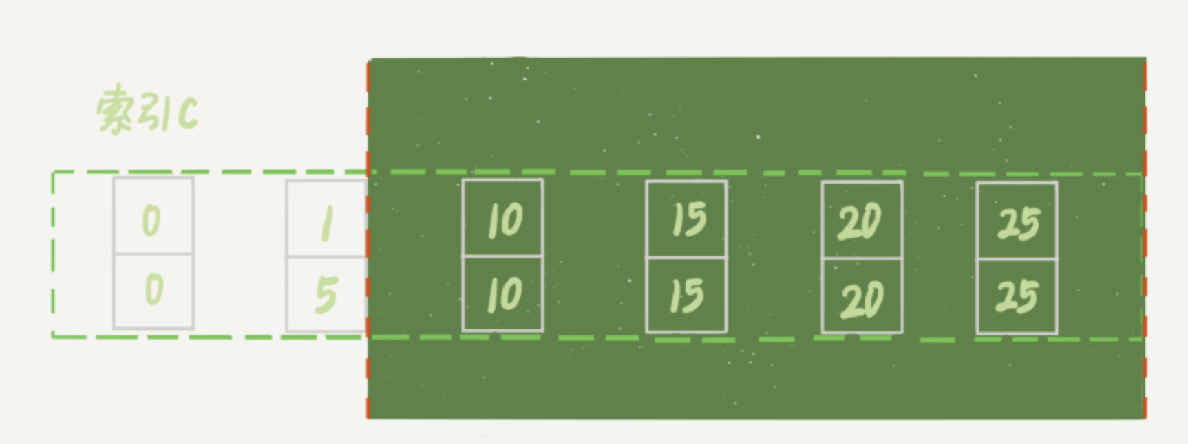 CREATE TABLE `t` ( `id` int(11) NOT NULL, `c` int(11) DEFAULT NULL, `d` int(11) DEFAULT NULL, PRIMARY KEY (`id`), KEY `c` (`c`)) ENGINE=InnoDB;insert into t values(0,0,0),(5,5,5),(10,10,10),(15,15,15),(20,20,20),(25,25,25);